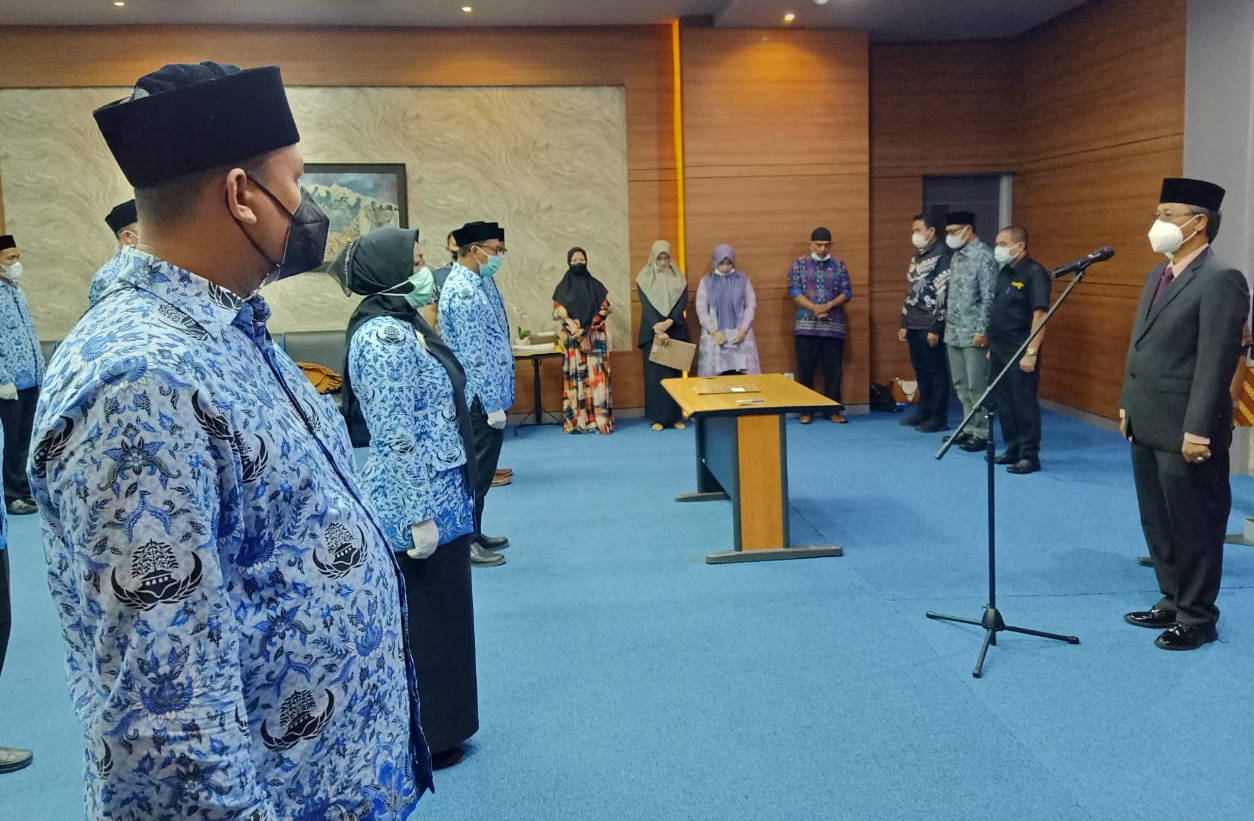 Asisten Administrasi Umum Setda Aceh Dr. H. Iskandar, AP., S.Sos., M.Si. melakukan Pengambilan Sumpah dan Pelantikan Pejabat Eselon 3 dan 4 di Lingkungan Pemerintah Aceh Tahun 2021, acara tersebut dilaksanakan di Ruang Rapat Museum Tsunami Aceh, Kamis (22/7/2021, sore).