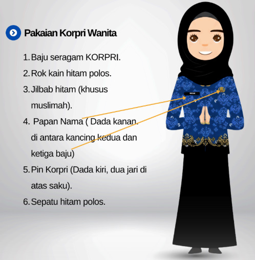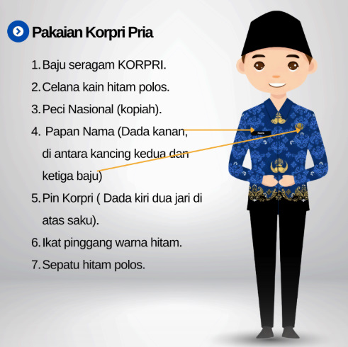 Pakaian : Pria dan wanita memakai Seragam Korpri lengkap dengan atribut.