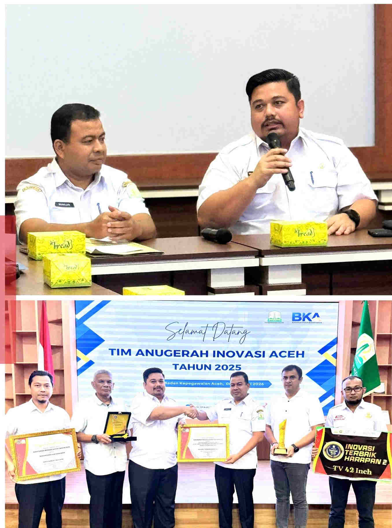 Banda Aceh, 4 Februari 2026 – Badan Kepegawaian Aceh (BKA) kembali menorehkan prestasi membanggakan dengan meraih dua penghargaan sekaligus pada ajang Anugerah Inovasi Aceh Tahun 2025. Dalam kegiatan tersebut, BKA berhasil memperoleh predikat SKPA Sangat Inovatif dan Inovasi Terbaik Harapan II melalui penerapan aplikasi CAT UDIN (Computer Assisted Test – Ujian Dinas dan Penyesuaian Kenaikan Pangkat).